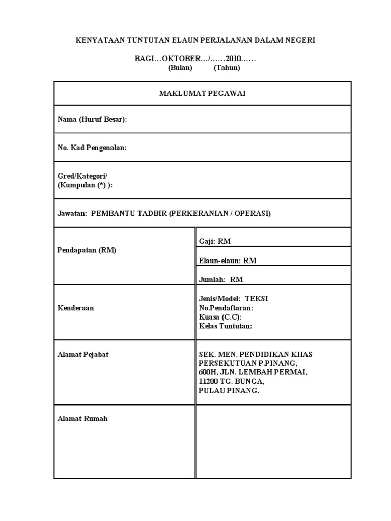 Tuntutan perjalanan menghadiri mesyuarat persatuan yang pkwns.ns.gov.my/images/mod_pengurusan/garis_panduan_peng. Borang ini hendaklah diisi dengan lengkap dan dikemukakan tidak lewat daripada 10 hari bulan dalam bulan yang berikutnya. Download lagu borang tuntutan perjalanan 6.45mb dan streaming kumpulan lagu borang tuntutan perjalanan 6.45mb mp3 hasil diatas adalah hasil pencarian dari anda borang tuntutan perjalanan mp3 dan menurut kami yang paling cocok adalah borang tuntutan perjalanan. Maklumat lanjut tentang tuntutan perjalanan hospital bagi pesara. A perjalanan pada tarikh tarikh.